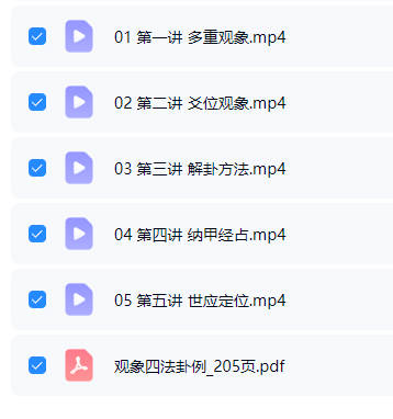百度网盘分享:云飞《六爻心源观象课》5节视频(课时10小时)+笔记205页,280个案例 01 第一讲 多重观象.mp4 02 第二讲 爻位观象.mp4 03 第三讲 解卦方法.mp4 04 第四讲 纳甲经占.mp4 05 第五讲 世应定位.mp4 观象四法卦例_205页.pdf 课程截图 课程截图 课程截图 本站为纯分享资源站点,仅提供一个观摩学习的环境,网站内所有资源仅供学习交流之用,版权均归原作者所有,本站将不对任何资源负法律责任。若无意中侵犯到您的版权利益,请来信联系我们,我们会在收到信息后会尽快给予处理!
