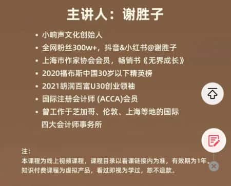主讲人:谢胜子·小响声文化创始人.全网粉丝300w+·上海市作家协会会员,畅销书《无界成长》2020福布斯中国30岁以下精英榜2021胡润百富U30创业领袖国际注册会计师(ACCA)会员曾工作于芝加哥、伦敦、上海等地的国际四大会计师事务所