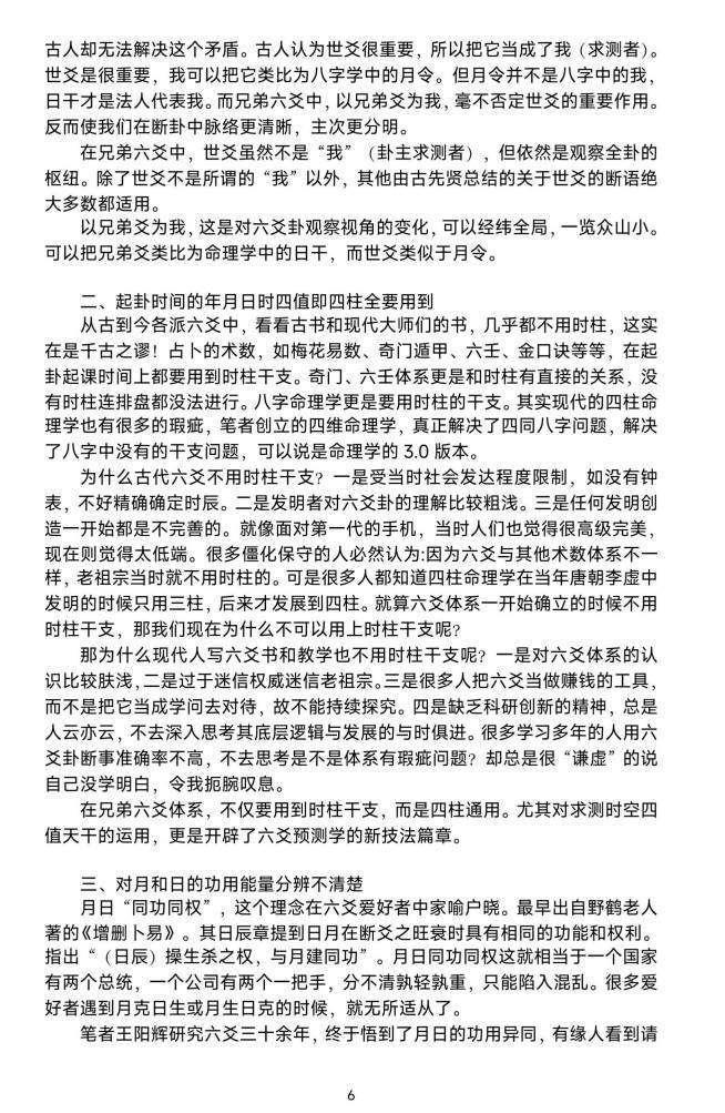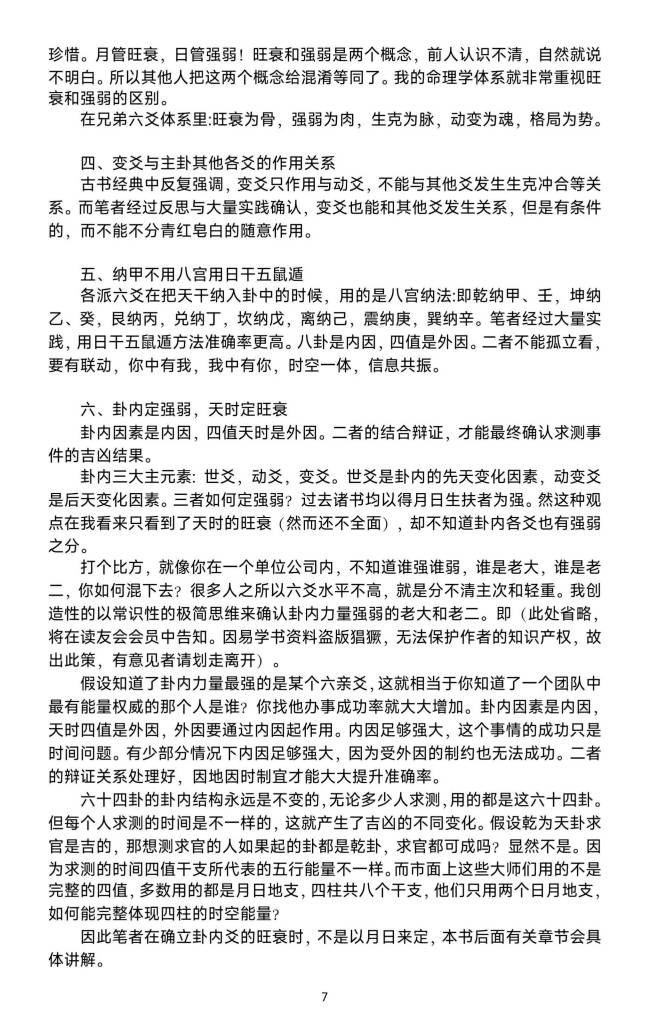 6、创造地性发明了“卦内定强弱,天时旺定衰”的原则,把内因外与因的因果证辩关系运用的火炉纯青。兄弟全息六体爻系映出衬其他六爻系体的片面错误,简直各是派六爻照的妖镜。必然到遭老旧派的攻击,然而真理辩越越明,掌握了弟兄六爻真的髓,必能体一会览众山小的境界。