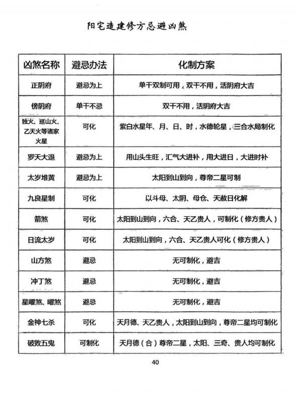 修造、封顶阳宅避煞表