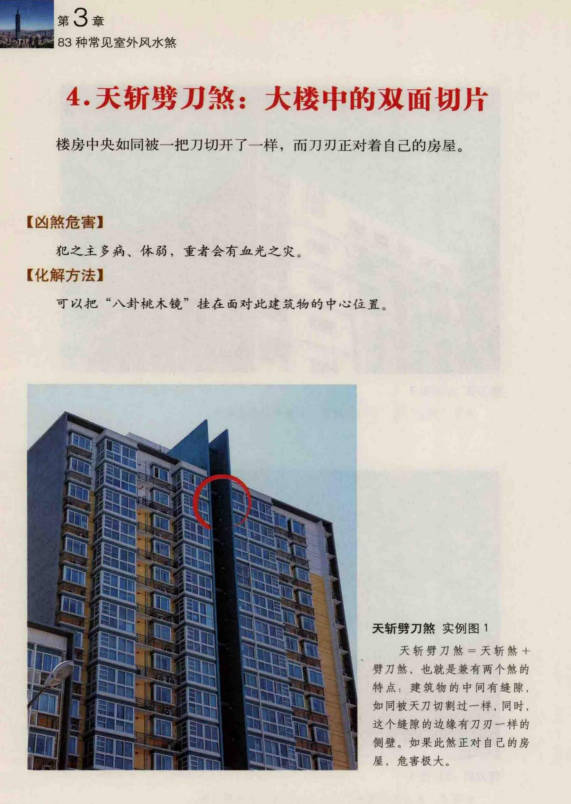古人对家宅的选址,布局,修建,装修是慎之又慎的。而如今,都市丛林十分拥挤,房屋形状千奇百怪,各种问题接连不断。地产商对利润的不负责任的追求,设计者对房屋布局的无知,规划者对造型的另类需要,使得很多房屋都存在风水问题:尖角冲射,道路反弓,天斩劈刀,厕所门正对其他房门……风水学把因错误地建筑,布局,装修构成的”陷阱”统称为”风水煞”.