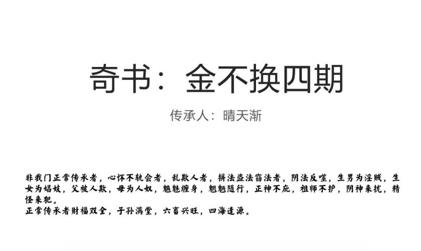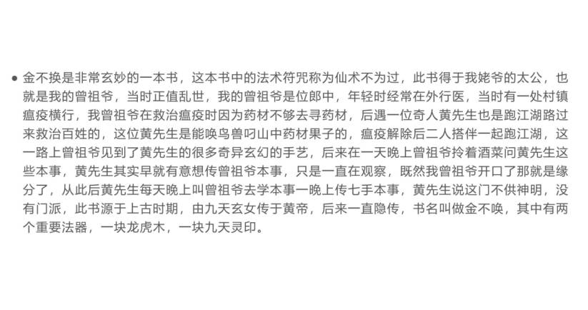 金不换是非常玄妙的一本书,这本书中的法术符咒称为仙术不为过,此书得于我姥爷的太公,也就是我的曾祖爷,当时正值乱世,我的曾祖爷是位郎中,年轻时经常在外行医,当时有一处村镇瘟疫横行,我曾祖爷在救治瘟疫时因为药材不够去寻药材,后遇一位奇人黄先生也是跑江湖路过来救治百姓的,这位黄先生是能唤鸟兽叼山中药材果子的,瘟疫解除后二人搭伴一起跑江湖,这一路上曾祖爷见到了黄先生的很多奇异玄幻的手艺,后来在一天晚上曾祖爷拎着酒菜问黄先生这些本事,黄先生其实早就有意想传曾祖爷本事,只是一直在观察,既然我曾祖爷开口了那就是缘分了,从此后黄先生每天晚上叫曾祖爷去学本事一晚上传七手本事,黄先生说这门不供神明,没有门派,此书源于上古时期,由九天玄女传于黄帝,后来一直隐传,书名叫做金不唤,其中有两个重要法器,一块龙虎木,一块九天灵印。