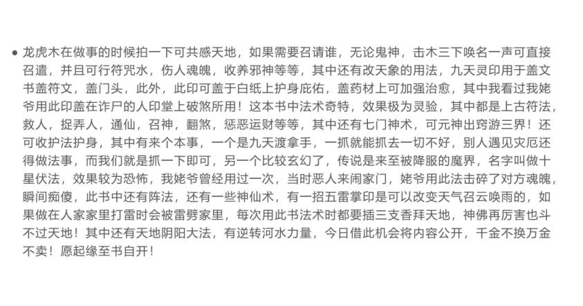 龙虎木在做事的时候拍一下可共感天地,如果需要召请谁,无论鬼神,击木三下唤名一声可直接召遣,并且可行符咒水,伤人魂魄,收养邪神等等,其中还有改天象的用法,九天灵印用于盖文书盖符文,盖门头,此外,此印可盖于白纸上护身庇佑,盖药材上可加强治愈,其中我看过我姥爷用此印盖在诈尸的人印堂上破煞所用!这本书中法术奇特,效果极为灵验,其中都是上古符法,救人,捉弄人,通仙,召神,翻煞,惩恶运财等等,其中还有七门神术,可元神出窍游三界!还可收护法护身,其中有来个本事,一个是九天渡拿手,一抓就能抓去一切不好,别人遇见灾厄还得做法事,而我们就是抓一下即可,另一个比较玄幻了,传说是来至被降服的魔界,名字叫做十星伏法,效果较为恐怖,我姥爷曾经用过一次,当时恶人来闹家门,姥爷用此法击碎了对方魂魄,瞬间痴傻,此书中还有阵法,还有一些神仙术,有一招五雷掌印是可以改变天气召云唤雨的,如果做在人家家里打雷时会被雷劈家里,每次用此书法术时都要插三支香拜天地,神佛再厉害也斗不过天地!其中还有天地阴阳大法,有逆转河水力量,今日借此机会将内容公开,千金不换万金不卖!愿起缘至书自开!