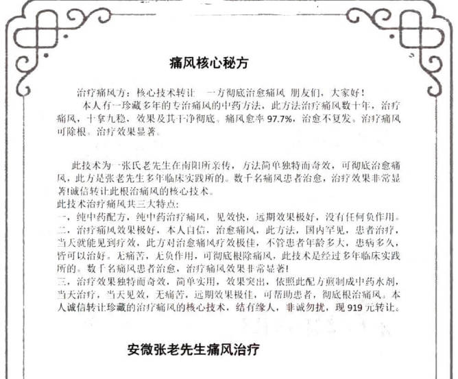 珍藏多年的专治痛风的中药方法,此方法治疗痛风数十年,治疗痛风,十拿九稳,效果及其干净彻底。痛风愈率97.7%,治愈不复发。治疗痛风可除根。治疗效果显著。此技术为一张氏老先生在南阳所亲传,方法简单独特而奇效,可彻底治愈痛风,此方是张老先生多年临床实践所的。数千名痛风患者治愈,治疗效果非常显著!诚信转让此根治痛风的核心技术。