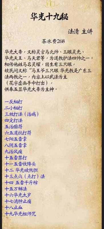 一反秘打二小秘打三放打法(治病)四定打法五治癫符六五道抗打符七阳五雷掌八阴五雷掌九治风痛十五雷禁打十一五雷收降头十二华光破煞胆十三点穴(点打)法十四五雷千斤榨十五万解法十六华光太岁十七消肿止痛十八止血十九华光祖师咒