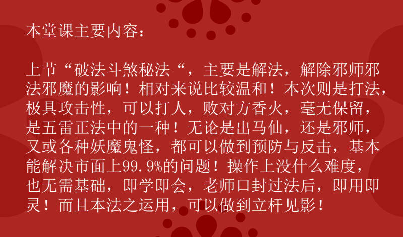 这是打法,极具攻击性,不仅可以打邪精、出马、各种妖魔鬼怪,也可以打人,败对方香火,毫无保留传授,是五雷正法中的一种!