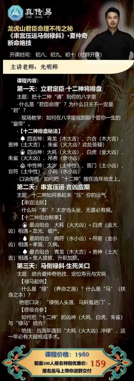 把光明师传承的龙虎山君臣命理 + 夏仲奇断命绝技,三天全部拆解给你。