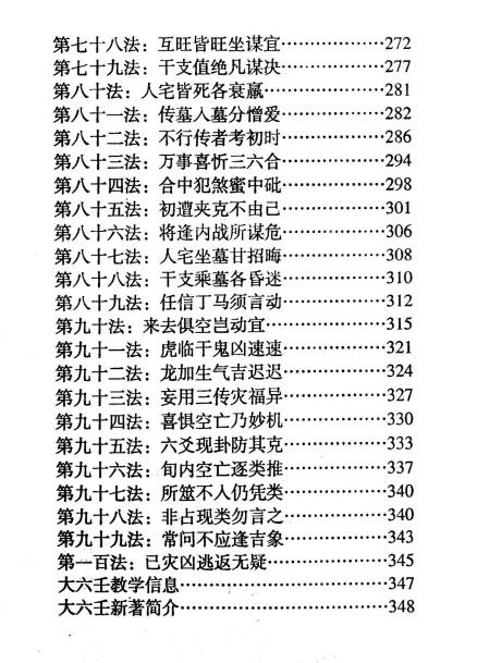 【内容大纲】 1. 前言 2. 第一法至第二十三法:基础断卦技法,含前后引从、首尾相见、帘幕贵人、催官使者等核心技法 3. 第二十四法至第五十法:进阶断卦技法,含干支传用、财官鬼煞、三传递生/互克、贵人禄马等实战技法 4. 第五十一法至第七十七法:高阶断卦技法,含魁度天门、两蛇夹墓、虎视逢虎、空亡应用、宾主互克等专项技法 5. 第七十八法至第一百法:综合断卦技法,含互旺互坐、干支值绝、三六合、空亡妙用、六爻卦防克等收尾技法 6. 大六壬教学信息、大六壬新著简介