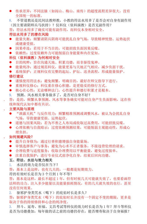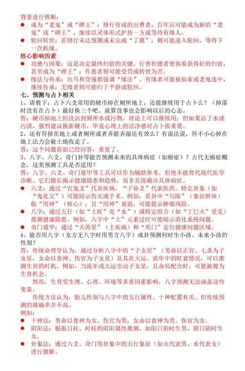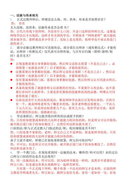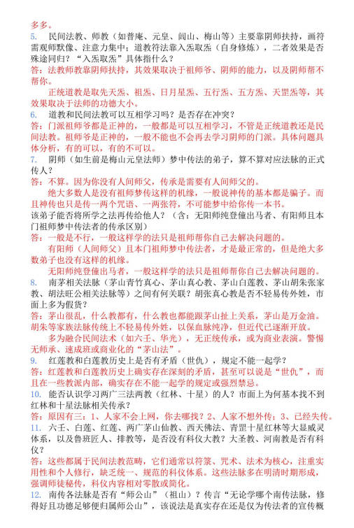 【资料简介】该资料是一套民间法教、道教科仪与术数命理综合问答汇编,涵盖法脉传承规则、百年后归属与阴师体系、科仪与法诀效力、出曹/出马传承、八字六爻预测、堕胎超度、三魂祭祀、授箓奏职流程等全维度核心议题,结合传统教义与民间实践,解答传承、修心、实效等关键问题。适合法教学习者、术数爱好者、民俗文化研究者、道教科仪从业者参考。
