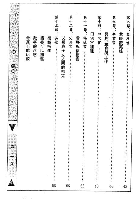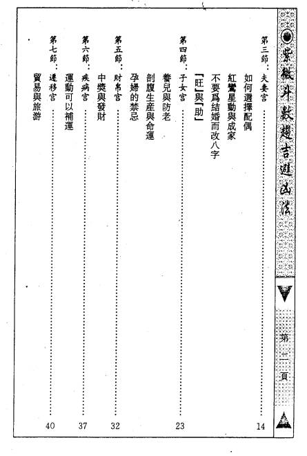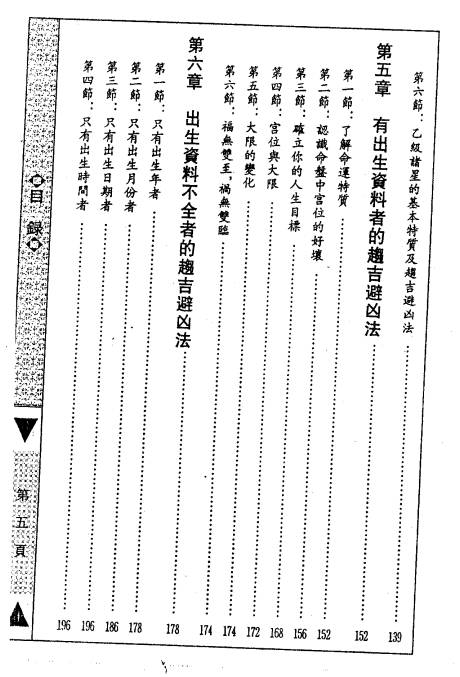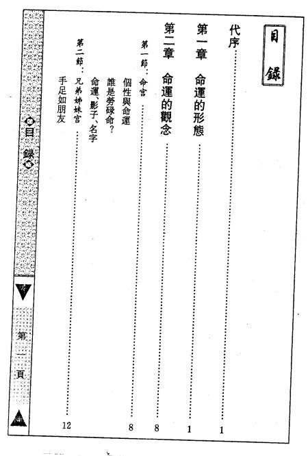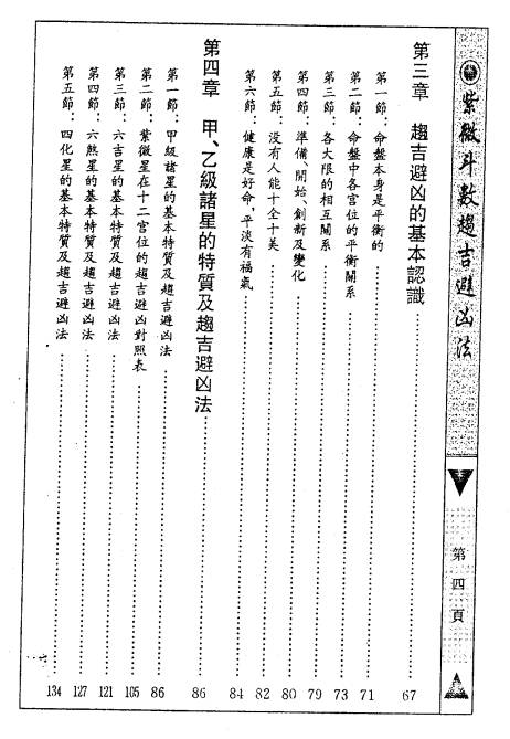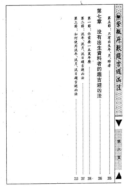 【内容大纲】 1. 命运的形态与命运的观念 2. 十二宫详解(命宫、兄弟姊妹宫、夫妻宫、子女宫、财帛宫、疾厄宫、迁移宫、交友宫、事业宫、田宅宫、福德宫、父母宫等) 3. 趋吉避凶的基本认识 4. 甲、乙级诸星的特质及趋吉避凶法 5. 有出生资料者的趋吉避凶法 6. 出生资料不全者的趋吉避凶法 7. 没有出生资料者的趋吉避凶法 8. 流年、流月、流日趋吉避凶法