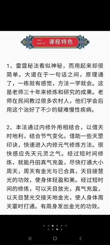1、雷霆秘法看似神秘,而用起来却很简单。大道在于一句话之间,原理通了,一练就有感觉,方法一学就会。这是老师三十年来修炼和研究的成果,老师在民间教过很多农村人,他们学会后用这个治好了不少的是难慢性疾病。