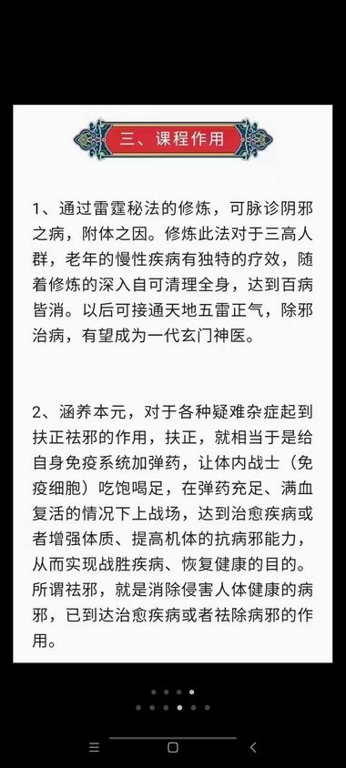 3,通过雷霆秘法的修炼,可脉诊阴邪之病,附体之因。修炼此法对于三高人群,老年的慢性疾病有独特的疗效,随着修炼的深入自可清理全身,达到百病皆消,以后可接通天地五雷正气,除邪治病,有望成为一代玄门神医。