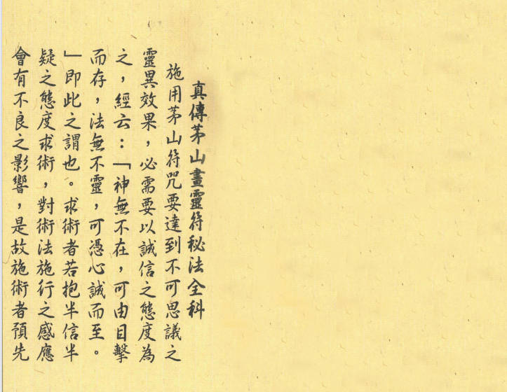 《茅山内秘符法》真传茅山画灵符秘法全科、术士本身修养、道坛设置、灵力培养、画灵符秘诀、画符经验、秘传六甲坛灵修真诀、天皇神咒修真术、李铁拐导神出游术、吴真人神符定风术、黄长房神法缩地术、邢和璞预算人心术、叶天师飞沙走石术、吕洞宾玉房砂术、金刚太阴指功术、李群仙飞魂摄魄术、太上感应神仙修真秘术、三山祖师真传行术口诀、三山祛解神数、三山消煞神术、茅山保身神术、茅山收魂术、辰州化水神术、茅山驱邪镇宅神术、茅山五雷神术、茅山神验小术四法、(茅山止儿夜啼术、茅山止儿剃头哭闹术、茅山制蜂不蜇术、茅山制飞虫夜不入室术)、茅山惩制恶人神术、天师真传神术、茅山照水碗神术、湘西行尸术、白莲教护身术、峨眉道长真传神术四法(止血神术、止痛神术、探井神术、和睦神术)、秘传开运神术、马来峇旺巫术全科、(施行巫术秘诀、峇旺爱情降头术、峇旺痴情降头术、峇旺做合姻缘降头术、巫法爱情油术、神秘爱情香水巫术)、秘传马来巫师万应巫术(族行巫术规则、辟邪巫术、爱情巫术、迷恋巫术、拆散巫术、憎恨巫术、护身巫术、万应巫术)南洋巫法制人术、异人炼五老仙杖奇术、茅山养鬼术、真传人鬼合形术、夜祭阴兵秘法、灵修异能透视眼、飞头魔法秘诀土科、秘传沙门祭炼鬼魂巫术(沙门收鬼魂法、沙门祭炼鬼魂法、役使鬼魂法、鬼魂幻形法、养鬼遣放法、)、茅山养鬼术、玄机阴功赌术(花草化水赌术、阴功秘诀赌术、密咒五鬼赌术、奇法遁牌赌术、阴魂显真术)、灵修耳报术、茅山阴魂报异术、测字术(第六感测字术、灵乩预测术、神秘祭字术)、祈富神术、茅山厕我翁奇术、神秘彩篮求字术、灵验三山法术(灵感预知术、春梦奇趣术、花带化蛇术、)法门奇技(九龙化骨、法门转桌、神功兢走、无匙开锁、障眼遁身)、神验秘诀专科(收蚊术、收鼠术、捕鱼术、捉鳖术、捕蛙术)、中国茅山法全科(茅山始祖于吉法术、茅山华阳洞生符术、茅山三茅真君符术、茅山太乙火符法术、茅山术士医形术、茅山异人迷魂术、茅山真传降神术、茅山过火术、茅山神砂防身术、茅山作法寻人术、茅山秘传玉府符奇术、茅山秘炼甲马神行术、茅山封符炼妖异术、茅山雷火神针奇术、茅山上刀山术、茅山刀剑不伤术、茅山人体浮空术、茅山万应出赛秘术、茅山异人避祸术、茅山幼儿护身术、茅山偷情奇术、茅山云雨不疲术、茅山九姑水晶球异术、茅山九姑和合术、茅山符法奇缘缘术.等,内容很多。
