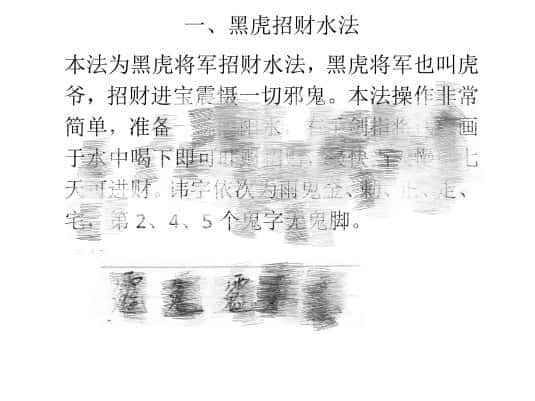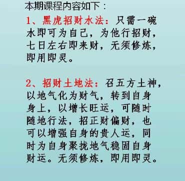 1、黑虎招财水法:只需一碗水即可为自己,为他行招财,七日左右即来财,无须修炼,即用即灵。