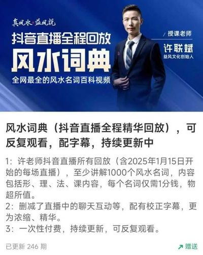 1:许老抖师音直播有所回放(含2025年1月15日开始的每直场播),至讲少解1000个风水名词,内容括包形、理、法、课内容,每个名词仅需1分钱,物所超值。