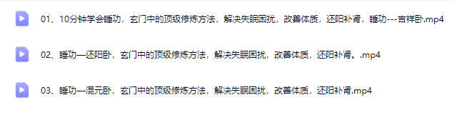 百度网盘分享:武当凌云【混元卧还阳吉祥】视频三集 【课程目录】 01、10分钟学会睡功,玄门中的顶级修炼方法,解决失眠困扰,改善体质,还阳补肾,睡功—吉祥卧.mp4 02、睡功—还阳卧,玄门中的顶级修炼方法,解决失眠困扰,改善体质,还阳补肾。.mp4 03、睡功—混元卧,玄门中的顶级修炼方法,解决失眠困扰,改善体质,还阳补肾.mp4 课程截图 课程截图 本站为纯分享资源站点,仅提供一个观摩学习的环境,网站内所有资源仅供学习交流之用,版权均归原作者所有,本站将不对任何资源负法律责任。若无意中侵犯到您的版权利益,请来信联系我们,我们会在收到信息后会尽快给予处理!