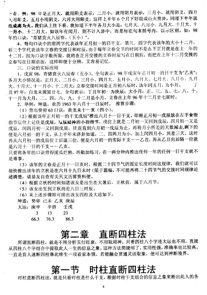 盲人排八字都是用流年赶,每年两句,每句七字,缩为每年一句,每句七字。熟练后便能在两分钟左右快速地推出每年各个节气的交接时间和任何一日的干支,而且更容易理解和记忆。
