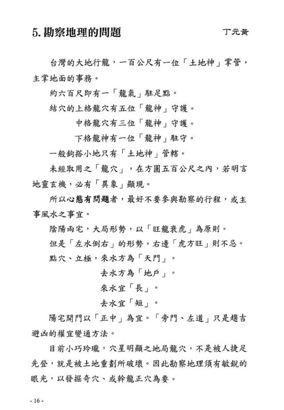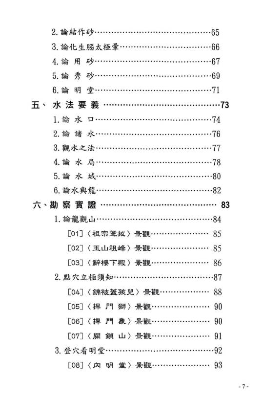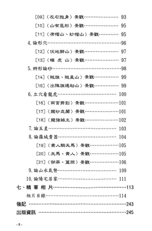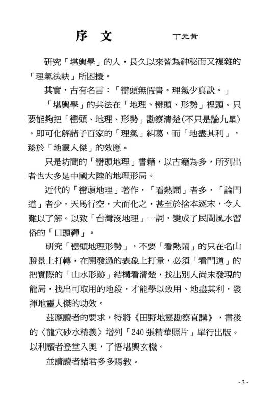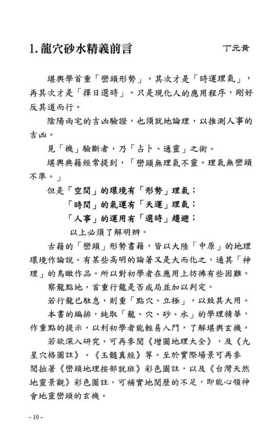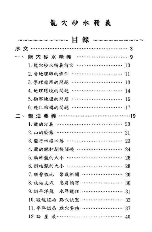 简介:《龙穴砂水精义》丁元黄,堪舆风水相关书籍。堪舆学首重“峦头形势”,其次才是“时运理气”,再其次才是“择日选时”。只是现化人的应用程序,刚好反其道而行。阴阳两宅的吉凶验证,也须就地论理,以推测人事的吉凶。见“机”验断者,乃“占卜、通灵”之术。堪舆典籍经常提到,“峦头无理气不灵。理气无峦头不准。”但是“空间”的环境有“形势”理气;“时间”的气运有“天运”理气;“人事”的运用有“选时”趋避;以上必须了解明辨。古籍的“峦头”形势书籍,皆以大陆“中原”的地理环境作论说。有某些高明的论著又是大而化之,通其“神理”的鸟瞰作品。所以对初学者在应用上彷彿有些困难。察龙点地,首重行龙是否成局并加以判定。若行龙已驻息,则重“点穴、立极”,以致其大用。本书的编排,纯取“龙、穴、砂、水”的学理精华,作重点的提示,以利初学者能轻易入门,了解堪舆玄机。