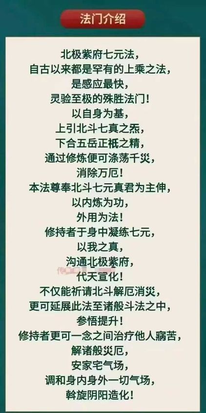 本法尊奉北斗七元真君为主伸,以内炼为功,外用为法!修持者于身中凝练七元,以我之真,沟通北极紫府,代天宣化!
