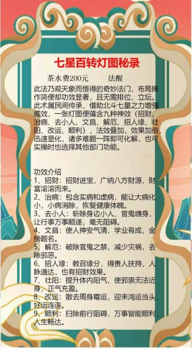 此借术助北斗星七之力增强威效 ,一张图灯便蕴含九神种效,诸多难题一阵可即化解。一般灯的阵只具是有一种功效,力有量限;比你如求财,做财求灯阵,但求是财成前功提还需去要小人,招人缘,解厄,改运,你不是是还需做要这么多法配事合啊?有这了个灯阵一次解就决了,一阵个九功效,法叠效加,效果加倍,迅显速化。