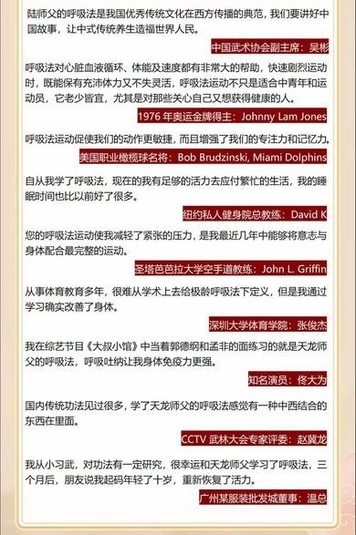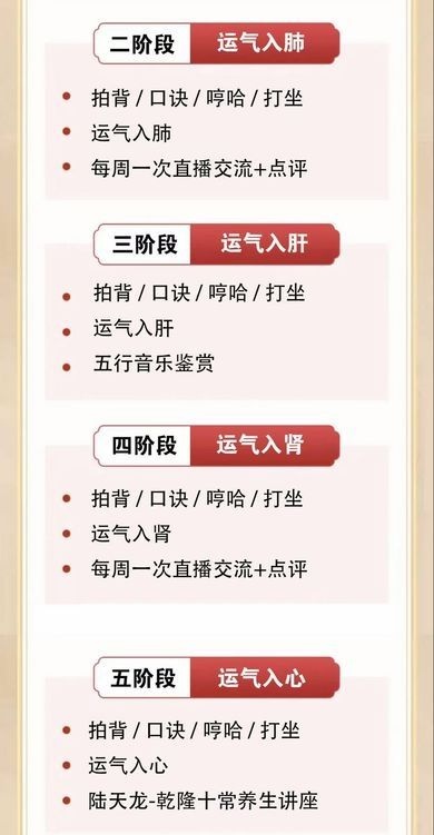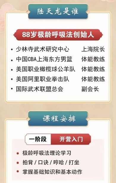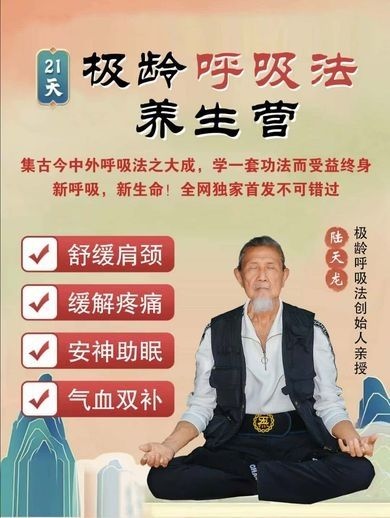 陆天龙《极龄呼吸法》是一门以呼吸训练为核心,结合科学养生指导的综合性课程。该课程通过特定的呼吸方法,帮助参与者在21天的时间内,实现身体和心理的双重蜕变。课程不仅教授呼吸技巧,还融入了养生知识,旨在提升学员的身心健康水平。 一、课程内容课程内容分为多个阶段,每个阶段都有特定的训练目标和教学内容:1. 开营指导及预习:包括呼吸入门讲解、拍背操教学、哼哈吐纳技巧等,为学员打下坚实的呼吸基础。2. 第一阶段:入门学习:通过陆天龙老师的教学和大弟子带练,学员将学习基本的呼吸方法和动作要领。3. 第二阶段至第五阶段:分别针对肺、肝、肾、心等器官进行运气训练,每个阶段都包含标准口令版教学、大弟子带练、点评和纠正等环节,确保学员能够正确掌握呼吸技巧。4. 具体训练内容:• 运气入肺:通过特定的呼吸方法,将气息引入肺部,增强肺部功能。• 运气入肝:将气息引入肝脏,促进肝脏的排毒和代谢功能。• 运气入肾:通过呼吸训练,增强肾脏功能,提升身体的元气。• 运气入心:将气息引入心脏,调节心率,增强心脏功能。