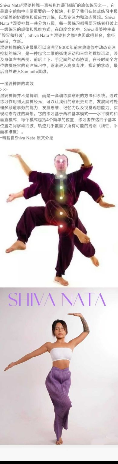 Shiva Nata®湿婆神舞⼀直被称作最“烧脑”的瑜伽练习之⼀,它是寰宇瑜伽中⾮常重要的⼀个板块,补⾜了我们在体式练习中极少涵盖的协调性和反应⼒训练,以及专注⼒和动态冥想。