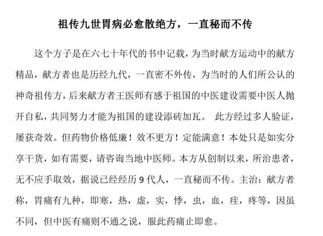 这个方子是在六七十年代的书中记载,为当时献方运动中的献方精品,献方者也是历经九代,一直密不外传,为当时的人们所公认的神奇祖传方,后来献方者王医师有感于祖国的中医建设需要中医人抛开自私,共同努力才能为祖国的建设添砖加瓦。此方经过多人验证,屡获奇效。但药物价格低廉!效不更方!定能满意!本处只是如实分享干货,如有需要,请咨询当地中医师。本方从创制以来,所治患者,无不应手取效,据说已经经历9代人,一直秘而不传。