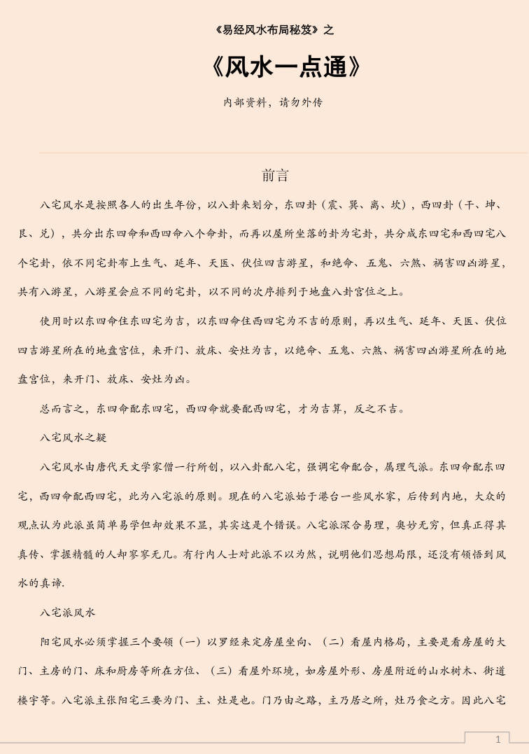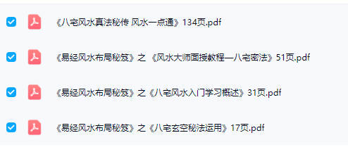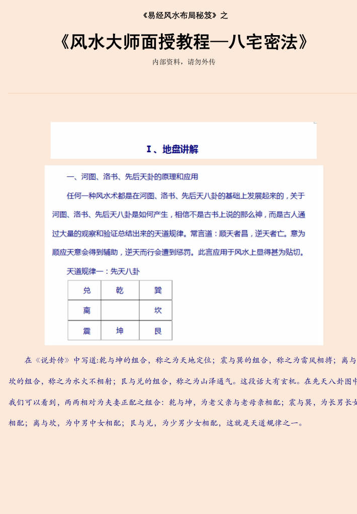 百度网盘分享 《易经风水布局秘笈》之《八宅风水合集》PDF电子版 《八宅风水真法秘传 风水一点通》134页.pdf 《易经风水布局秘笈》之 《风水大师面授教程—八宅密法》51页.pdf 《易经风水布局秘笈》之《八宅玄空秘法运用》17页.pdf 《易经风水布局秘笈》之《八宅风水入门学习概述》31页.pdf 部分页面截图 部分页面截图 部分页面截图 部分页面截图 本站为纯分享资源站点,仅提供一个观摩学习的环境,网站内所有资源仅供学习交流之用,版权均归原作者所有,本站将不对任何资源负法律责任。若无意中侵犯到您的版权利益,请来信联系我们,我们会在收到信息后会尽快给予处理!