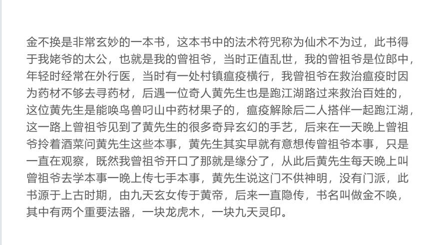 金不换是非常玄妙的一本书,这本书中的法术符咒称为仙术不为过,此书得于我姥爷的太公,也就是我的曾祖爷,当时正值乱世,我的曾祖爷是位郎中,年轻时经常在外行医,当时有一处村镇瘟疫横行,我曾祖爷在救治瘟疫时因为药材不够去寻药材,后遇一位奇人黄先生也是跑江湖路过来救治百姓的,这位黄先生是能唤鸟兽叼山中药材果子的,瘟疫解除后二人搭伴一起跑江湖,这一路上曾祖爷见到了黄先生的很多奇异玄幻的手艺,后来在一天晚上曾祖爷拎着酒菜问黄先生这些本事,黄先生其实早就有意想传曾祖爷本事,只是一直在观察,既然我曾祖爷开口了那就是缘分了,从此后黄先生每天晚上叫曾祖爷去学本事一晚上传七手本事,黄先生说这门不供神明,没有门派,此书源于上古时期,由九天玄女传于黄帝,后来一直隐传,书名叫做金不唤,其中有两个重要法器,一块龙虎木,一块九天灵印。