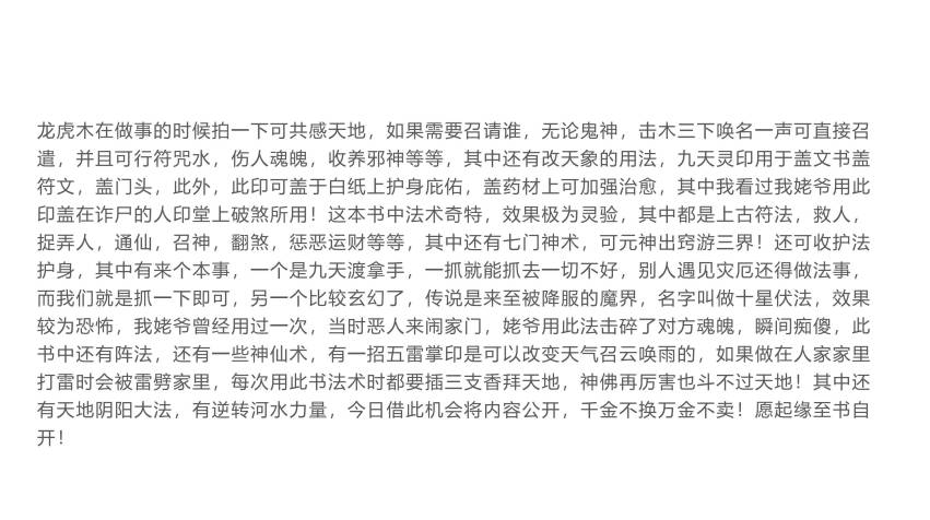 龙虎木在做事的时候拍一下可共感天地,如果需要召请谁,无论鬼神,击木三下唤名一声可直接召遣,并且可行符咒水,伤人魂魄,收养邪神等等,其中还有改天象的用法,九天灵印用于盖文书盖符文,盖门头,此外,此印可盖于白纸上护身庇佑,盖药材上可加强治愈,其中我看过我姥爷用此印盖在诈尸的人印堂上破煞所用!这本书中法术奇特,效果极为灵验,其中都是上古符法,救人,捉弄人,通仙,召神,翻煞,惩恶运财等等,其中还有七门神术,可元神出窍游三界!还可收护法护身,其中有来个本事,一个是九天渡拿手,一抓就能抓去一切不好,别人遇见灾厄还得做法事,而我们就是抓一下即可,另一个比较玄幻了,传说是来至被降服的魔界,名字叫做十星伏法,效果较为恐怖,我姥爷曾经用过一次,当时恶人来闹家门,姥爷用此法击碎了对方魂魄,瞬间痴傻,此书中还有阵法,还有一些神仙术,有一招五雷掌印是可以改变天气召云唤雨的,如果做在人家家里打雷时会被雷劈家里,每次用此书法术时都要插三支香拜天地,神佛再厉害也斗不过天地!其中还有天地阴阳大法,有逆转河水力量,今日借此机会将内容公开,千金不换万金不卖!愿起缘至书自开!
