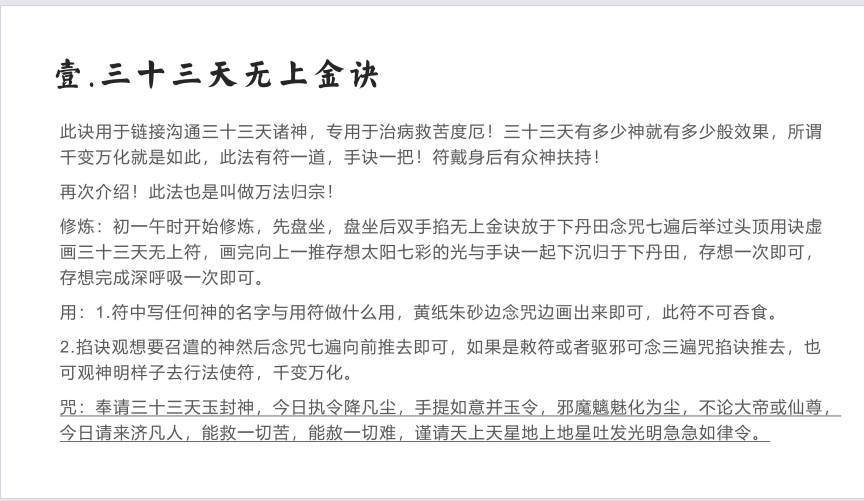 此诀用于链接沟通三十三天诸神,专用于治病救苦度厄!三十三天有多少神就有多少般效果,所谓千变万化就是如此,此法有符一道,手诀一把!符戴身后有众神扶持!