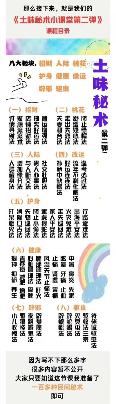 百度网盘分享《民间土味秘术》靓靓源生迹义·百种土味法术 视频一集 简单说,“土味秘术”是流传于民间方便好用,见效奇快 风格朴素但又充满神秘氛围 的民间技艺 更直白的说法就是 土味秘术讲究一个快速、高效 适用于生活中的各个场景 用以处理各种紧急事件 本站为纯分享资源站点,仅提供一个观摩学习的环境,网站内所有资源仅供学习交流之用,版权均归原作者所有,本站将不对任何资源负法律责任。若无意中侵犯到您的版权利益,请来信联系我们,我们会在收到信息后会尽快给予处理!