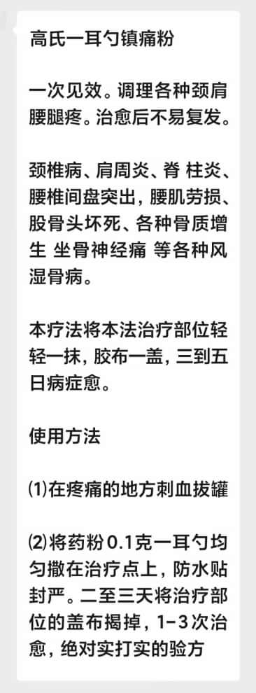 (2)将药粉0.1克一耳勺均匀撒在治疗点上,防水贴封严。二至三天将治疗部位的盖布揭掉,1-3次治愈,绝对实打实的验方