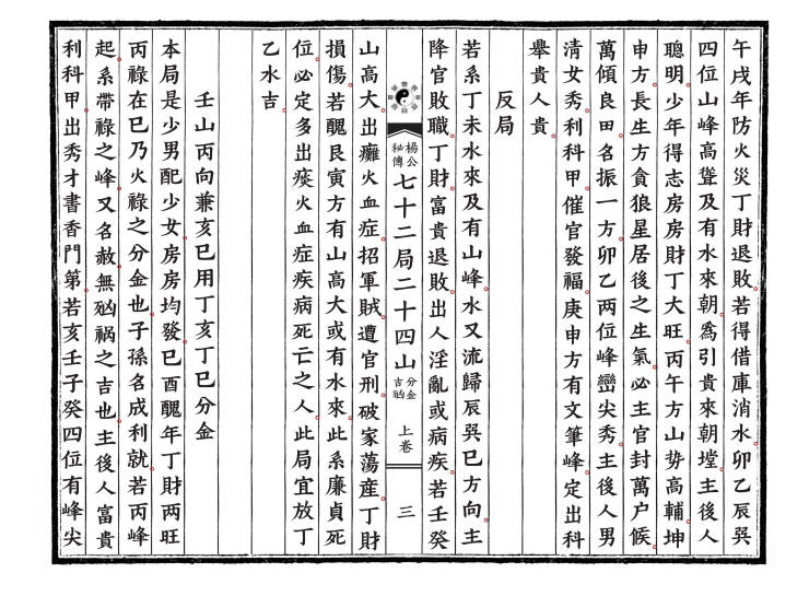 简介:《杨公秘传七十二局二十四山分金吉凶》上下两卷,堪舆风水相关书籍。