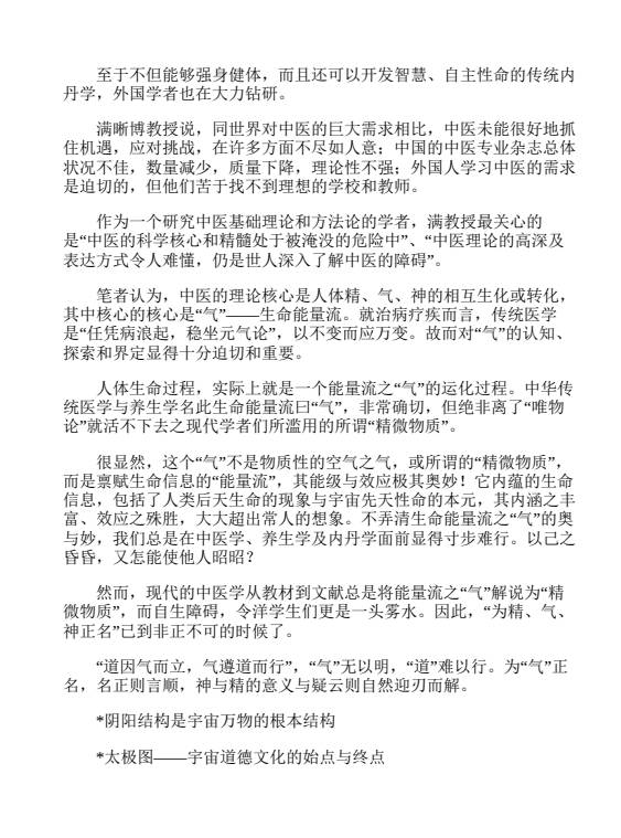 在探讨中医学与内丹学的全球化机遇与挑战时,书中指出,中医学与内丹学都是中国传统医学的重要组成部分,它们在强身健体和开发智慧方面具有独特的功效。同时,书中也讨论了后天谷气与先天元气的作用,强调了先天元气在人体健康中的重要作用。