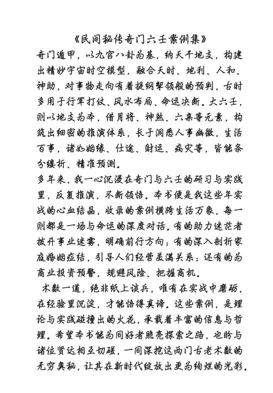 核心传承与成就大六壬:从古法入门,师从通道学高人如海老师系统研习大六壬通道学,打下深厚理论根基;后随无上公钻研运移之法;2022年加入陆好嫌老师《运移经》交流群,深耕5年,其悟性与成果获陆老师高度认可。融合古天文历算,破解“数理环扣”“应期推演”千年难题,实战精准度业内顶尖。奇门遁甲:通彻上古奇门本源,独创“意识奇门”,以自身意识体链接六丁六甲神,“意识入局”可魂穿古今、洞悉过往未来;所布奇门局暗合天地气机,兼具运筹与扭转局势之能,为现代奇门领域开创性突破。