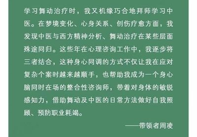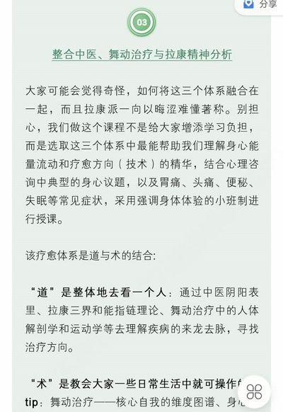 深度整合舞动治疗、拉康精神分析和中医。中医可以去除身体里的陈年垃圾,舞动治疗不给自己生产垃圾,精神分析可以让你看到这一切,帮你拓宽对来访的理解,找到咨询突破点,获得照顾身体和情绪的实用技能。