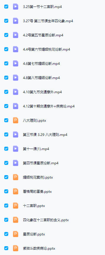 视频11课+7个文档pdf。涵盖疾病、星辰论断、四化象含义、十二宫职、富贵格局、婚姻桃花案例等内容,讲解许铨仁体系紫微斗数的用法,让你更快的去掌握。